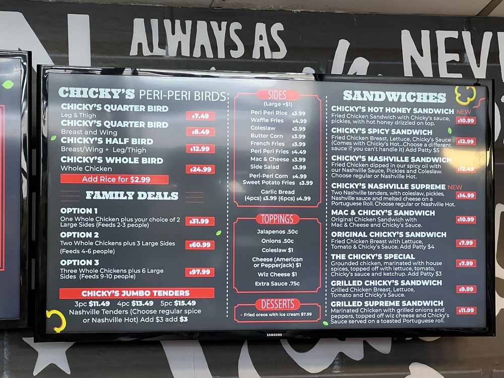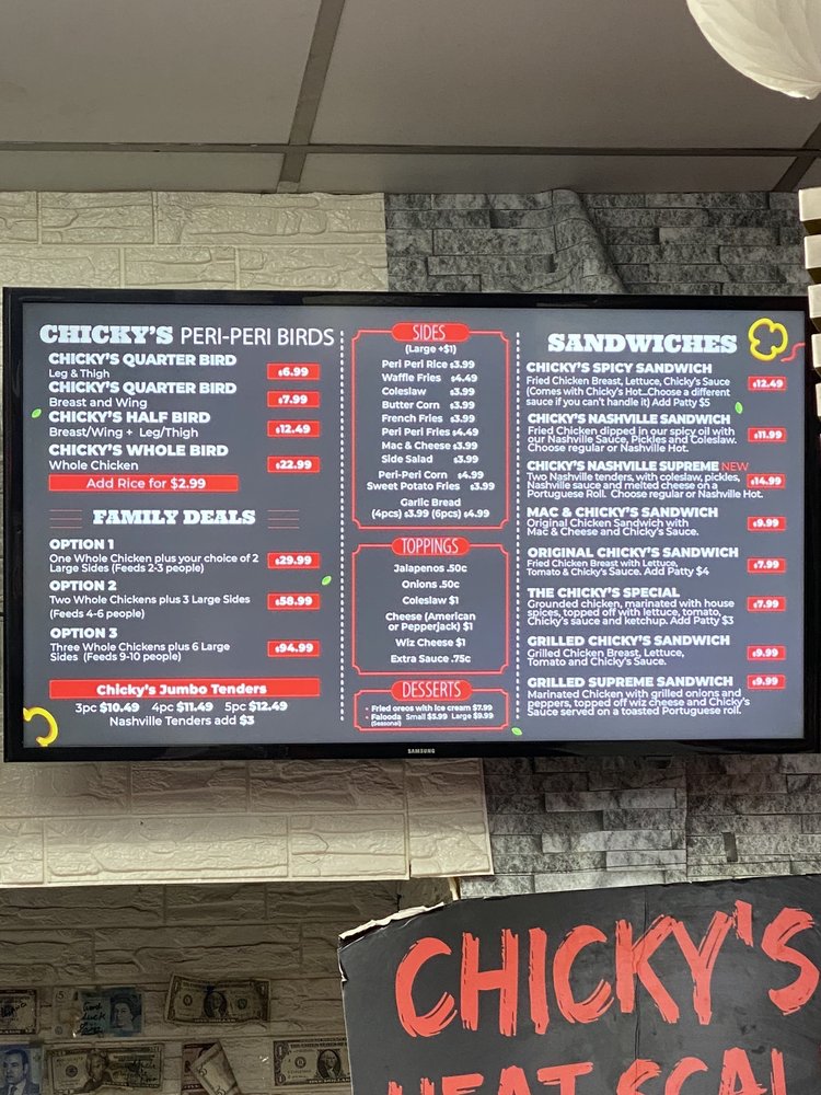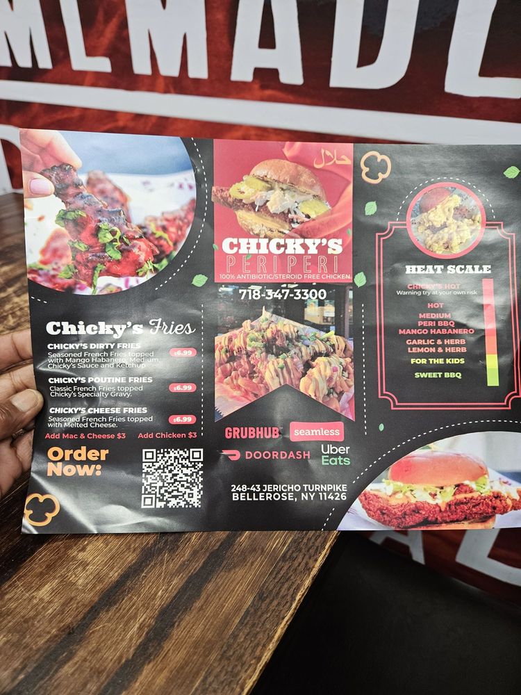 Chicky's is a Halal restaurant located in Bellerose, NY, offering a variety of grilled and flame-grilled peri-peri chicken dishes. The menu includes options like the Grilled Chicky's Sandwich, Chicky's Specialty Skewers, and Peri-Peri Chicky's Birds. Customers have praised the flavorful peri-peri chicken, spicy Nashville chicken, and the delicious wings with a choice of sauces. The casual ambiance and friendly customer service make it a favorite spot for many. While some found the prices slightly high, most agree that the quality and taste of the food justify the cost. Overall, Chicky's is a must-visit for chicken lovers looking for tasty and satisfying dishes in a cozy setting.